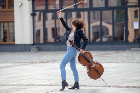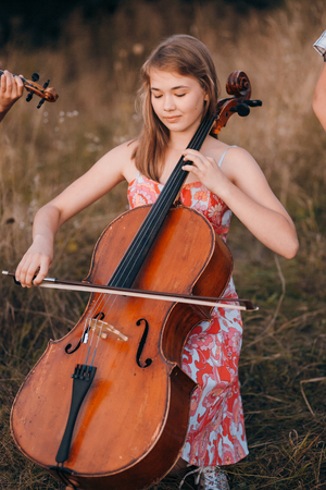 Young woman playing cello on stairs outdoors, closeup. Classic musical instrument