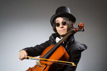 A joyful man plays the cello, evoking happiness. He smiles widely, showcasing passion amid a dark background.