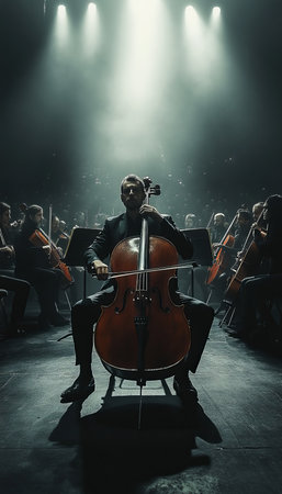 Cinematic portrait of a cellist surrounded by a symphonic orchestra in a dramatic setting