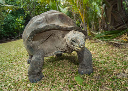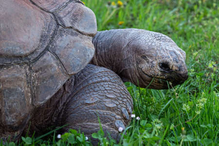 Giant turtle (Geochelone gigantea), endemic to the Islands of the Aldabra Atoll in the Seychelles, in natural conditions. This is one of the largest turtles in the world.