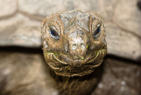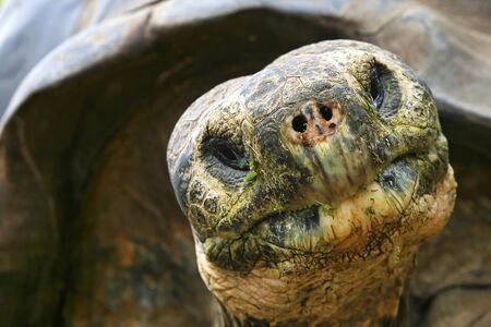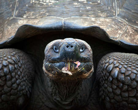 Closeup head on portrait of a wild Galapagos Tortoise (Chelonoidis nigra) with food in mouth in the Galapagos Islands, Ecuador.