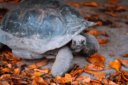 Big giant tortoise walking on the ground.