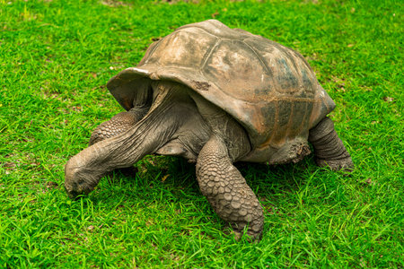 A massive Aldabra giant tortoise slowly walking and grazing on vibrant green grass in a tropical wildlife park