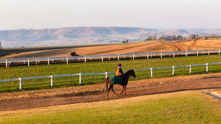 Race horse jockey rider training early dawn sunrise closeup running action silhouetted a scenic outdoors equestrian landscape.