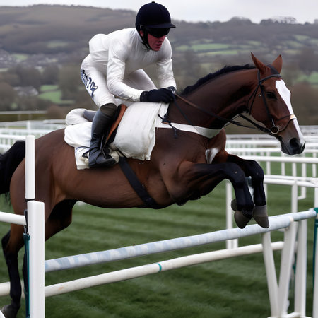 Dynamic image captures intense motion of horse racing event. Racehorse galloping at full speed with jockey urging horse onward. Blurred background