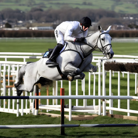 Jockey races towards victory on horse, leading competitors across vibrant grass racetrack