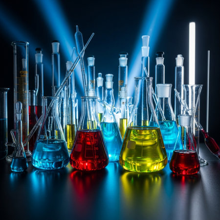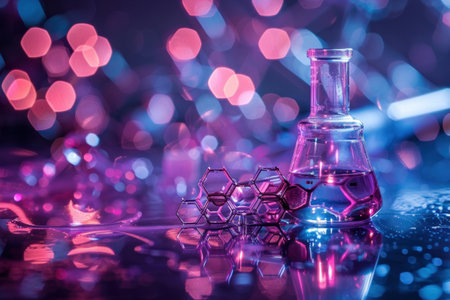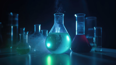 Artistic representation of laboratory glassware filled with vibrant liquids, showcasing chemical reactions and abstract molecular visuals for educational purposes.