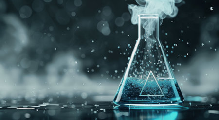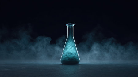 A captivating laboratory flask filled with an ethereal blue liquid, surrounded by wisps of smoke on a dark background, evoking mystery and scientific exploration.