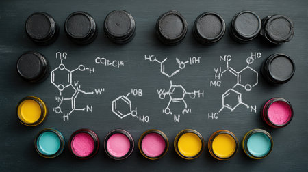 Colorful paint containers and intricate chemical structures are showcased on a dark background, blending art and science.
