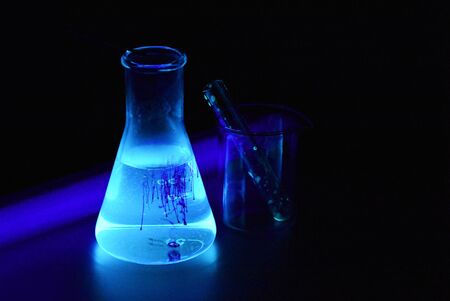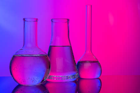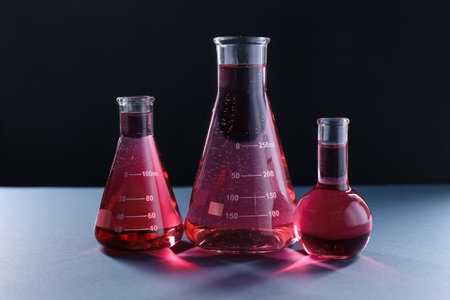 Laboratory glassware with colorful liquid on dark background. Science laboratory research and development concept.