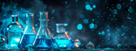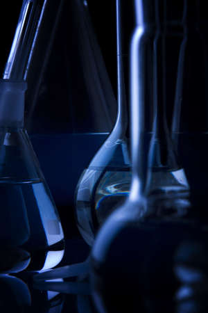 Blue chemical background with space for text. Flasks and test tubes on the table. Flasks with multicolored chemical liquids. The study of chemistry, chemical experiments and research.