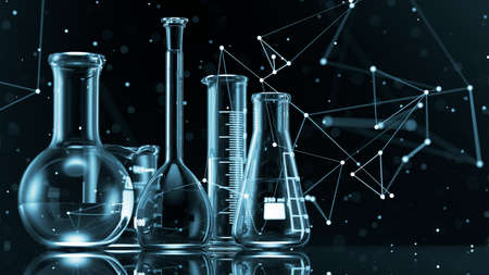 Glass chemistry lab equipment on black background. Chemistry Lab concept. 3d