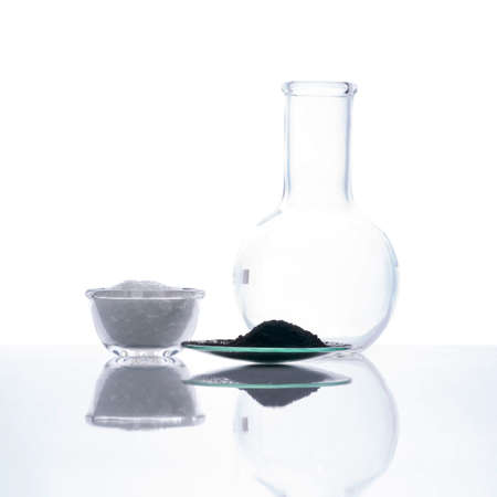Carbon Charcoal Powder in Chemical Watch Glass place next to Cetyl esters wax in glass container and Flat Bottom Flask. Side View