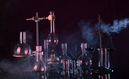 Laboratory glassware, chemical scales, tripod and a torch on dark background in the smoke