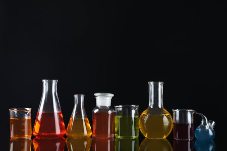 Laboratory glassware with colorful liquid on black background. Chemical laboratory equipment.