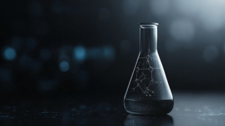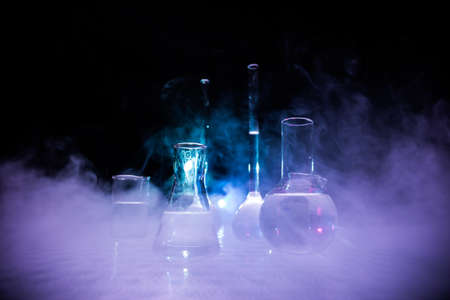 Pharmacy and chemistry theme. Test glass flask with solution in research laboratory. Science and medical background. Laboratory test tubes on dark toned background, science research equipment concept