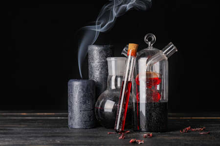 Colorful Erlenmeyer Flasks with Smoke Magical Potion Alchemy Experiment red blue dark wood glass
