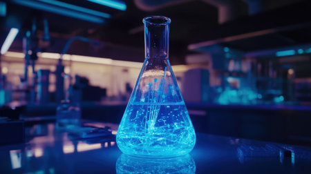 A scientific laboratory composition featuring beakers and flasks filled with blue liquid, placed on a metallic surface under futuristic lighting.