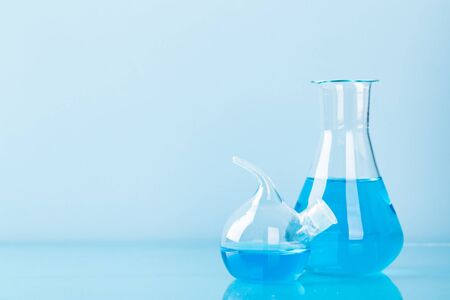 blue liquids in transparent flasks in the laboratory. test or research in lab. Technician testing chemistry lab experiment