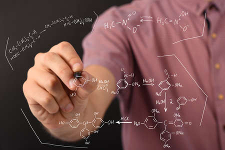 Man hand draws a reaction diagram of organic chemical compounds on black background. High resolution photo.