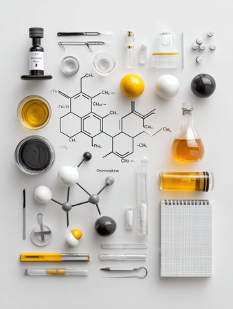 Laboratory tools and chemical structures are organized on a table, showcasing various beakers, flasks, and molecules during a scientific research session
