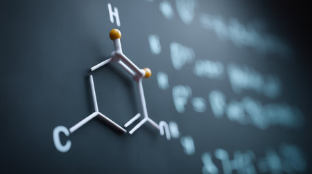 Close-up of a molecular structure on a blackboard with formulas, capturing the essence of science and education, ideal for educational and laboratory contexts.