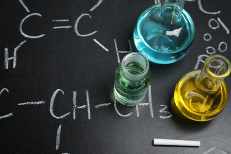 Laboratory glassware on blackboard with chemical formulas, closeup