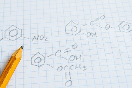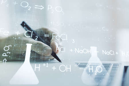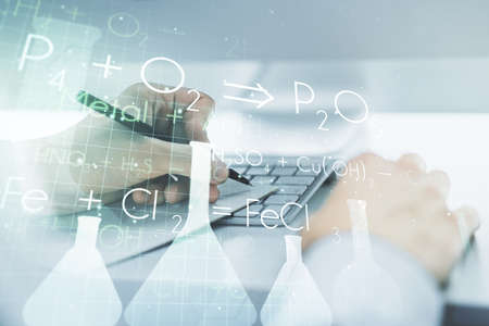 Creative chemistry concept with hand writing in notebook on background with laptop. Multiexposure
