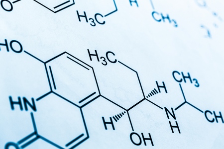 White powder on a marble background representing a pharmaceutical concept illustrating chemical structure and health care