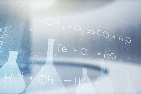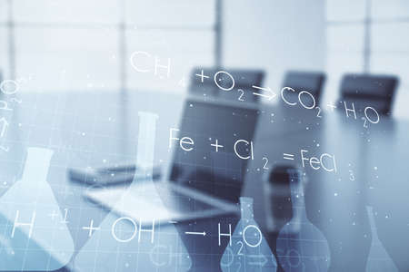 Creative chemistry concept and modern desktop with computer on background. Multiexposure