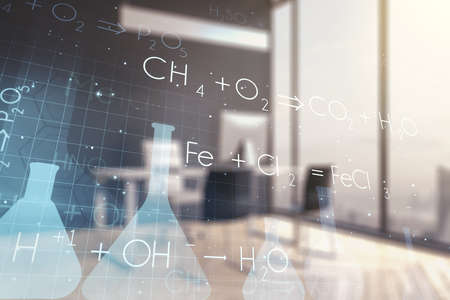Abstract virtual creative chemistry hologram on empty modern office background. Multiexposure
