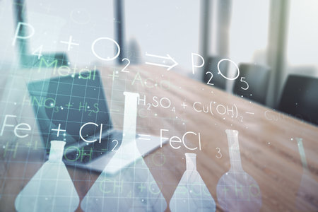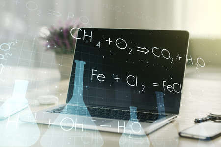 Double exposure of creative chemistry concept and modern desktop with laptop on background, research and development concept