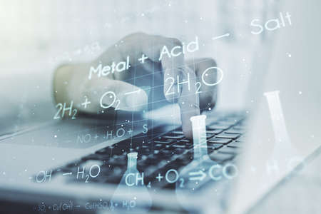 Creative chemistry illustration with hands typing on computer keyboard on background, science and research concept. Multiexposure