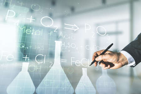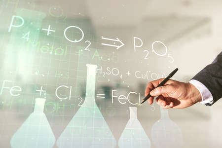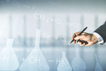 Man hand with pen working with abstract virtual Creative chemistry hologram on blurred office background. Multiexposure