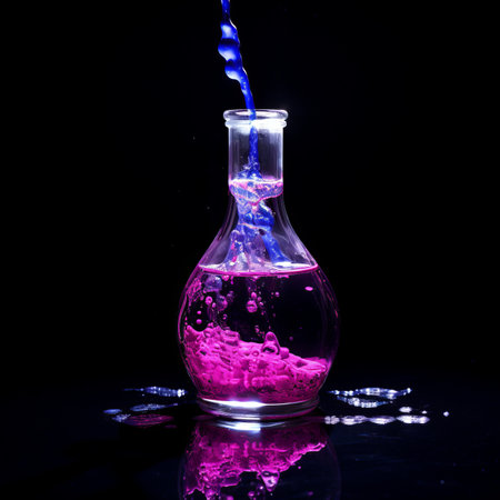 Close-up of a scientist's hands pouring a glowing, vibrant chemical from one beaker to another, with detailed reflections on the glass and precise droplets in mid-air, showcasing the precision of laboratory work