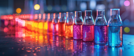 A vibrant laboratory scene featuring glass flasks with colorful liquids, highlighting scientific experimentation and research in a modern environment.