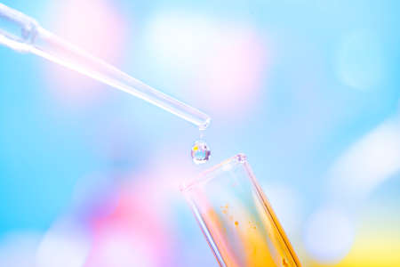 Chemical test tube with yellow liquid and a pipette with a drop of liquid. Chemical laboratory with reagents for experiments.