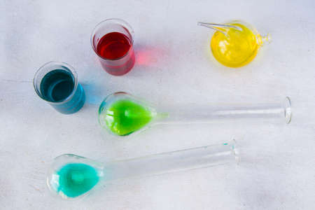 Color water glassware, reagents in the laboratory equipment, light and shadows