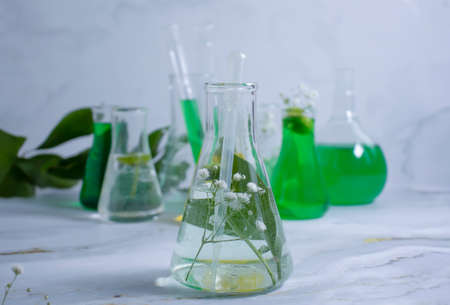 Natural organic extraction and green herbal leaves, Flower aroma essence solution in laboratory.