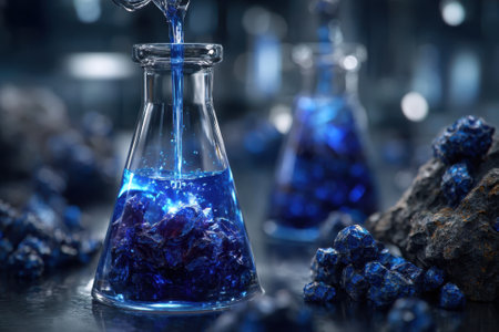 Blue liquid is poured into a glass flask next to mineral rocks in a modern laboratory setting.