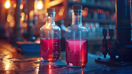 Laboratory glassware with pink liquid in scientific laboratory with AI generated.