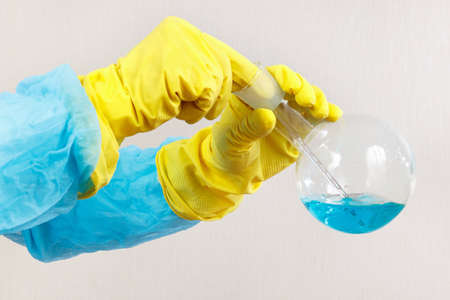 Researcher hands in rubber gloves engaged in chemical experiments in the laboratory