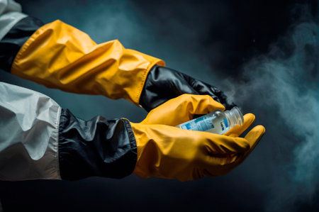 Photo of a person holding a bottle in their hand while wearing protective gloves. Generative AI.