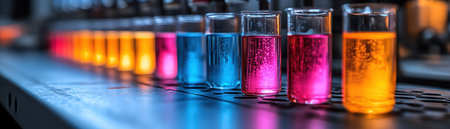 Close-up of laboratory glassware including test tubes and beakers filled with colorful liquids, in a vibrant, modern science laboratory setting.