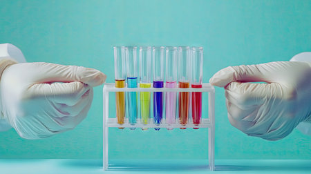 Gloved scientist hands holding test tube rack with multiple colorful chemical samples in a sterile laboratory