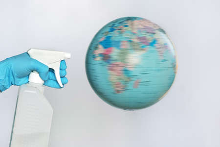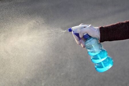 A human hand in a protective glove holds spray disinfectant for viruses prevention