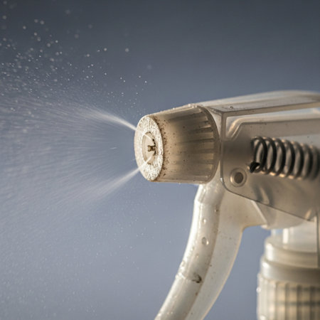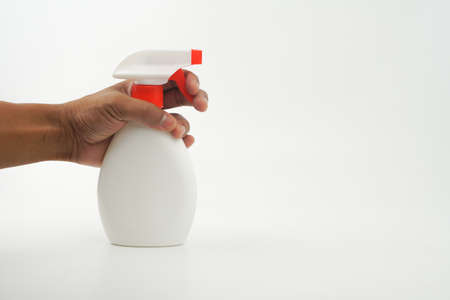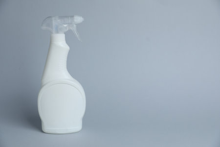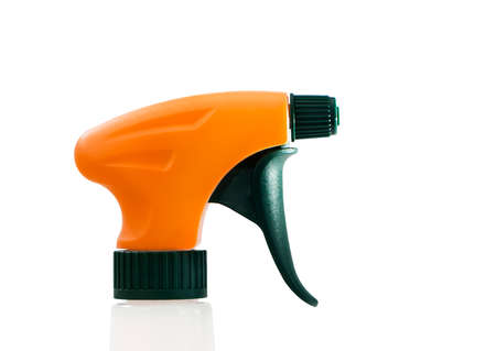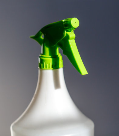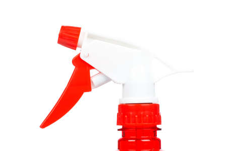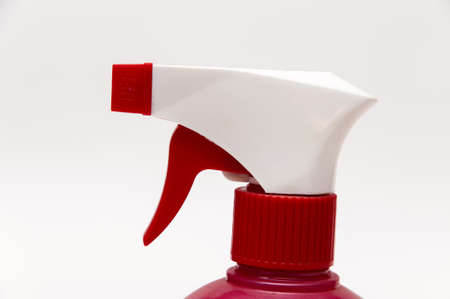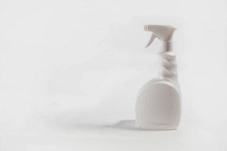Disinfectant spray bottle on white background. Close up on nozzle, copy space on left.