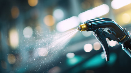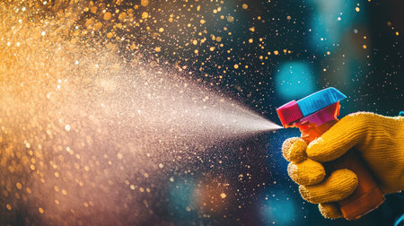 A vibrant image of gloves holding a spray bottle, with droplets landing on a dusty surface ready for cleaning.