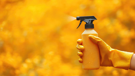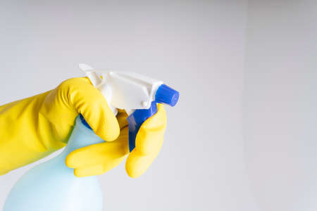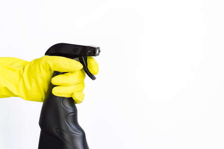 Hand in yellow rubber glove holding plastic spray bottle with cleaning detergent on yellow background