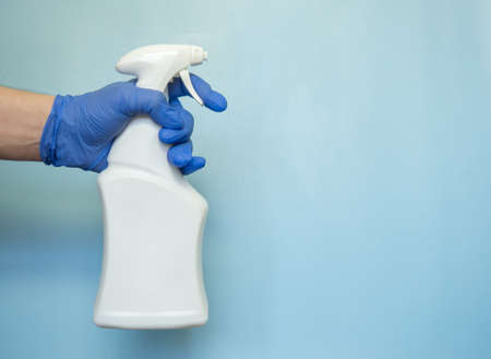 A hand in rubber glove hold the bottle of antiseptic spray. Protection concept